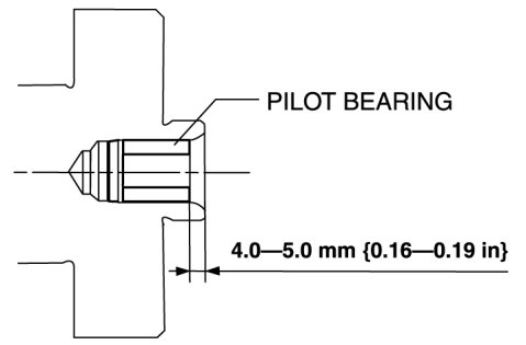 2. As shown in the figure, press-fit the pilot bearing to the position which is 4.0-5.0 mm {0.16-0.19 in} from the crankshaft end.