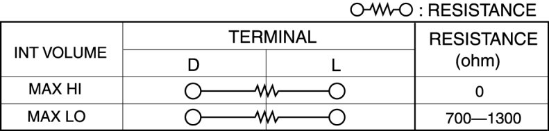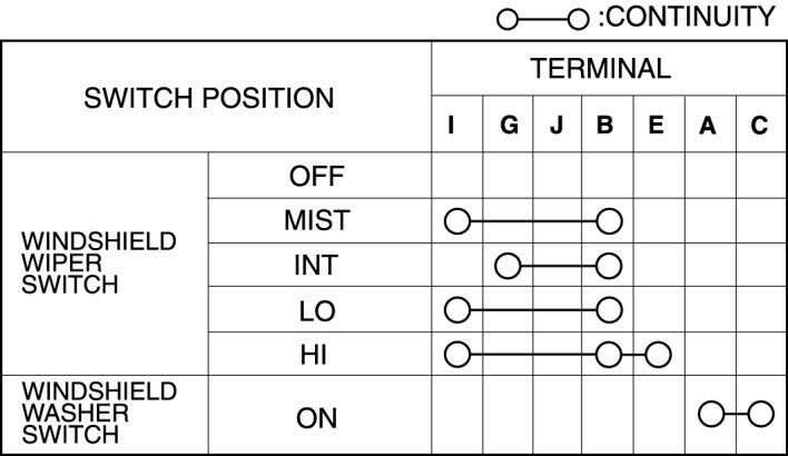 3. Verify that the resistance and continuity between the windshield wiper and washer switch terminals as indicated in the table.