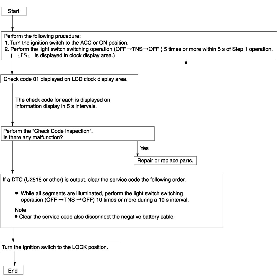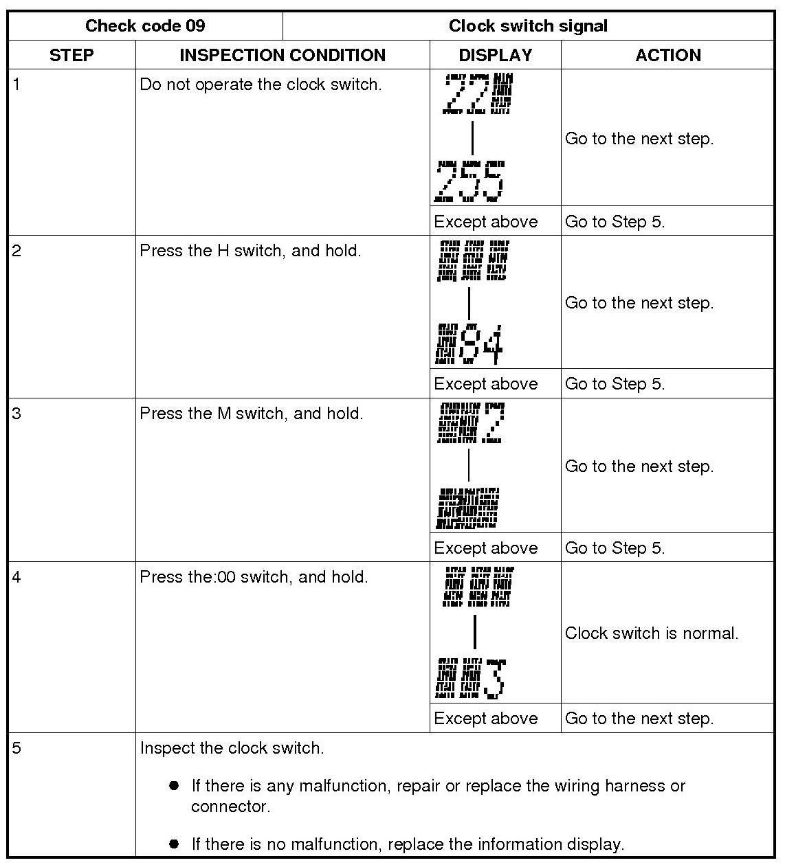 - The check codes are displayed in numerical order. (While performing the inspection, if you want to inspect a check code with a number smaller than the code number you are currently inspecting, terminate the check mode then repeat the inspection from the beginning.)