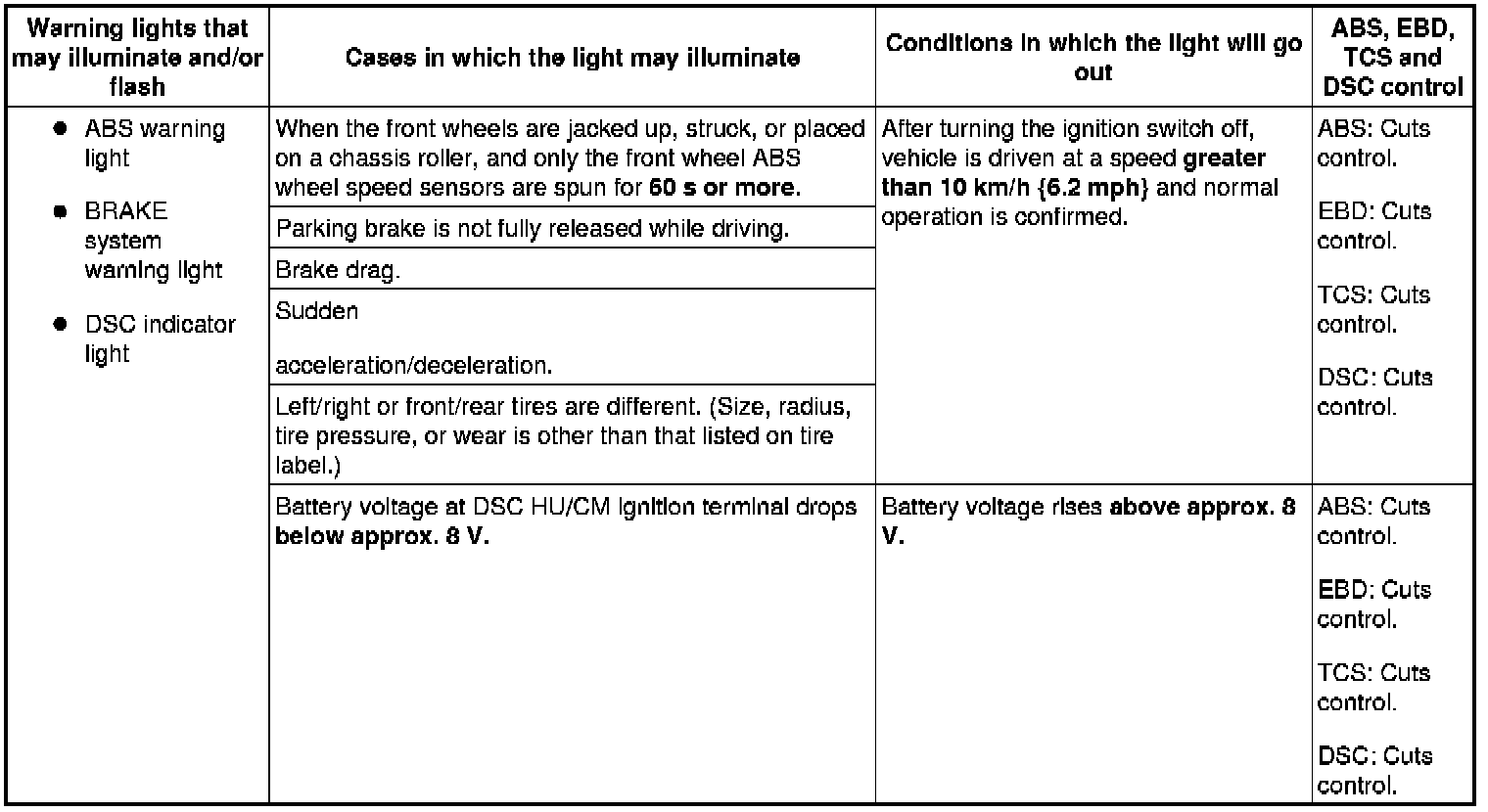 - After repairing the ABS wheel-speed sensor or ABS sensor rotor, or after replacing the control module, the ABS warning light may not go out even when the ignition switch is turned to the ON position. In this case, drive the vehicle at a speed of 10 km/h {6.2 mph} or more, make sure the ABS warning light goes out, and then clear the DTC.