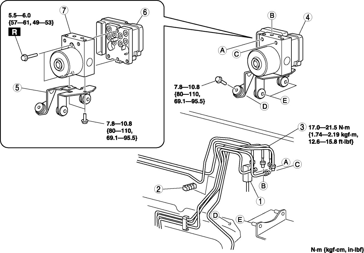 1. Align the marks made before removal and install the brake pipe into the DSC HU/CM referring to the figure.
