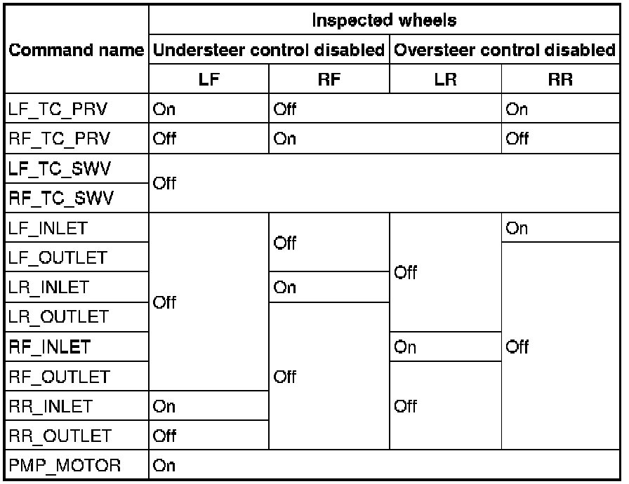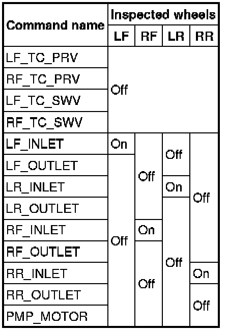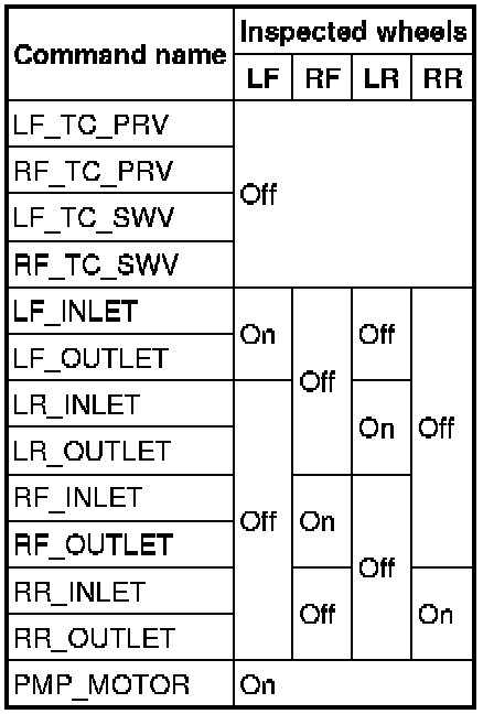 3. Set up an active command mode inspection according to the combination of commands below. Brake pressure retention