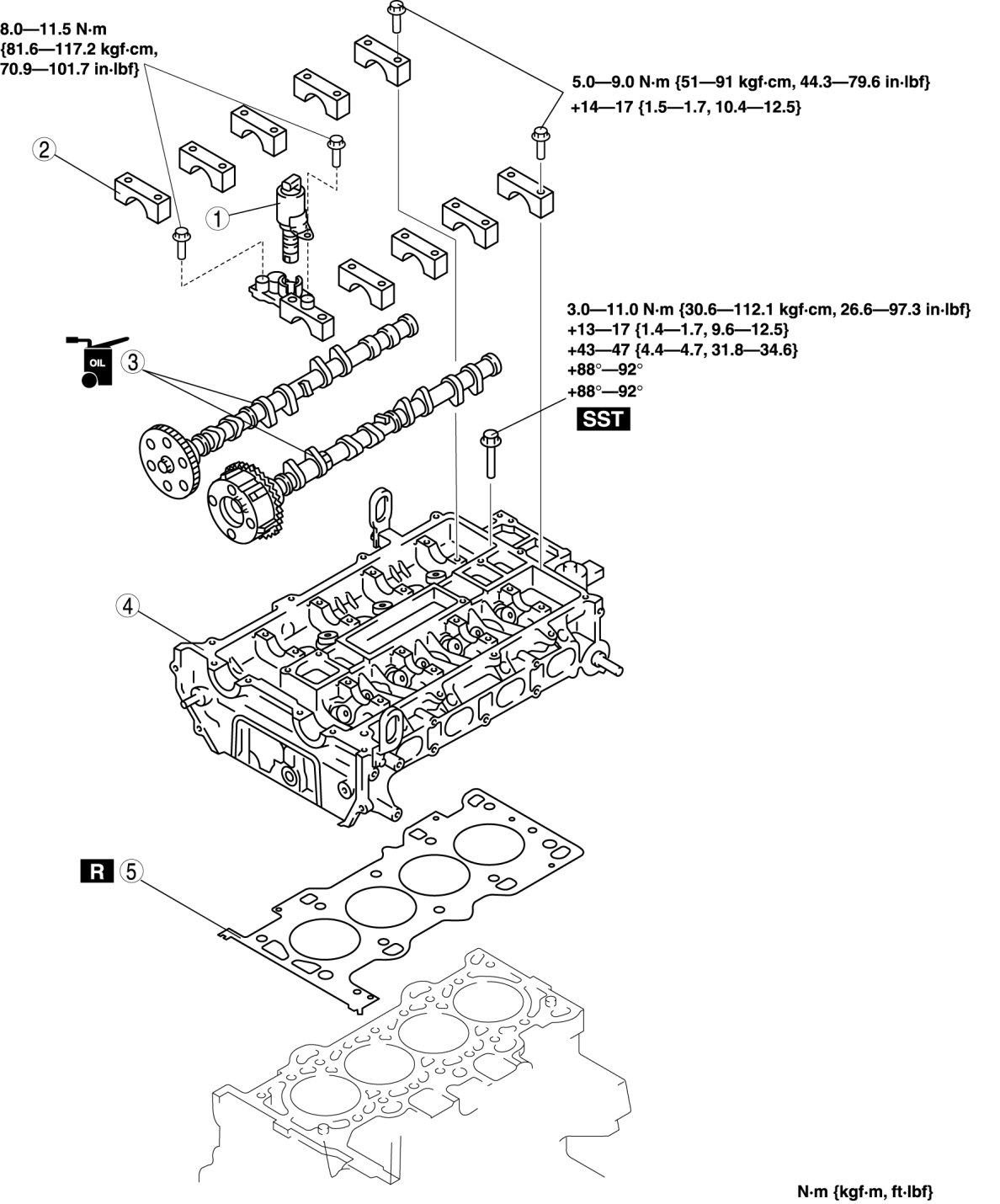 1. Loosen the camshaft cap bolts in 2-3 steps in the order shown in the figure.