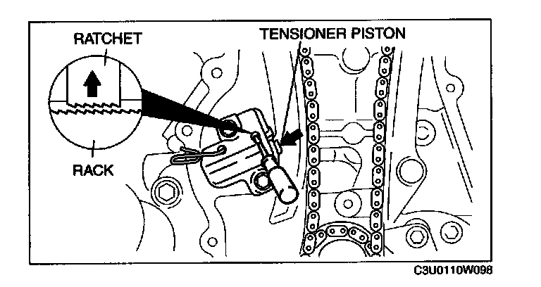 Chain Tensioner Disassembly Note1. Unlock the chain tensioner ratchet using a suitable screw driver or equivalent tool.