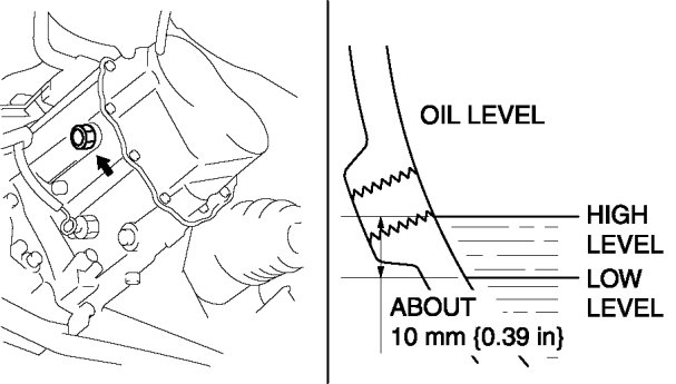 - If the oil level is lower than the low level, add the specified amount and type of oil through the oil level plug hole.