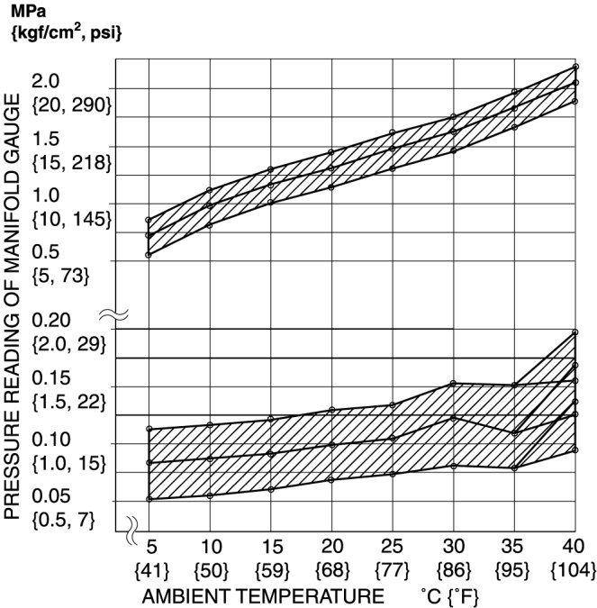 10. Verify that the intersection of the pressure reading of the manifold gauge and ambient temperature is in the shaded zone.
