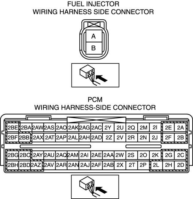 - Fuel injector No.1 terminal A and PCM terminal 2BB