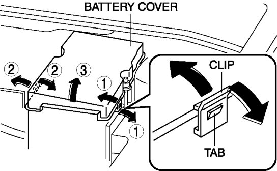 a. Pull the clip (LH) in the outward direction and disengage the battery cover tabs.