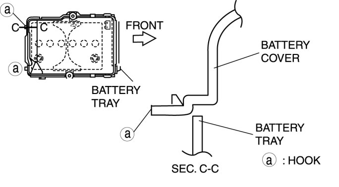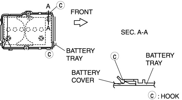 2. Install with battery cover hooks A aligned with the battery tray holes at two points.
