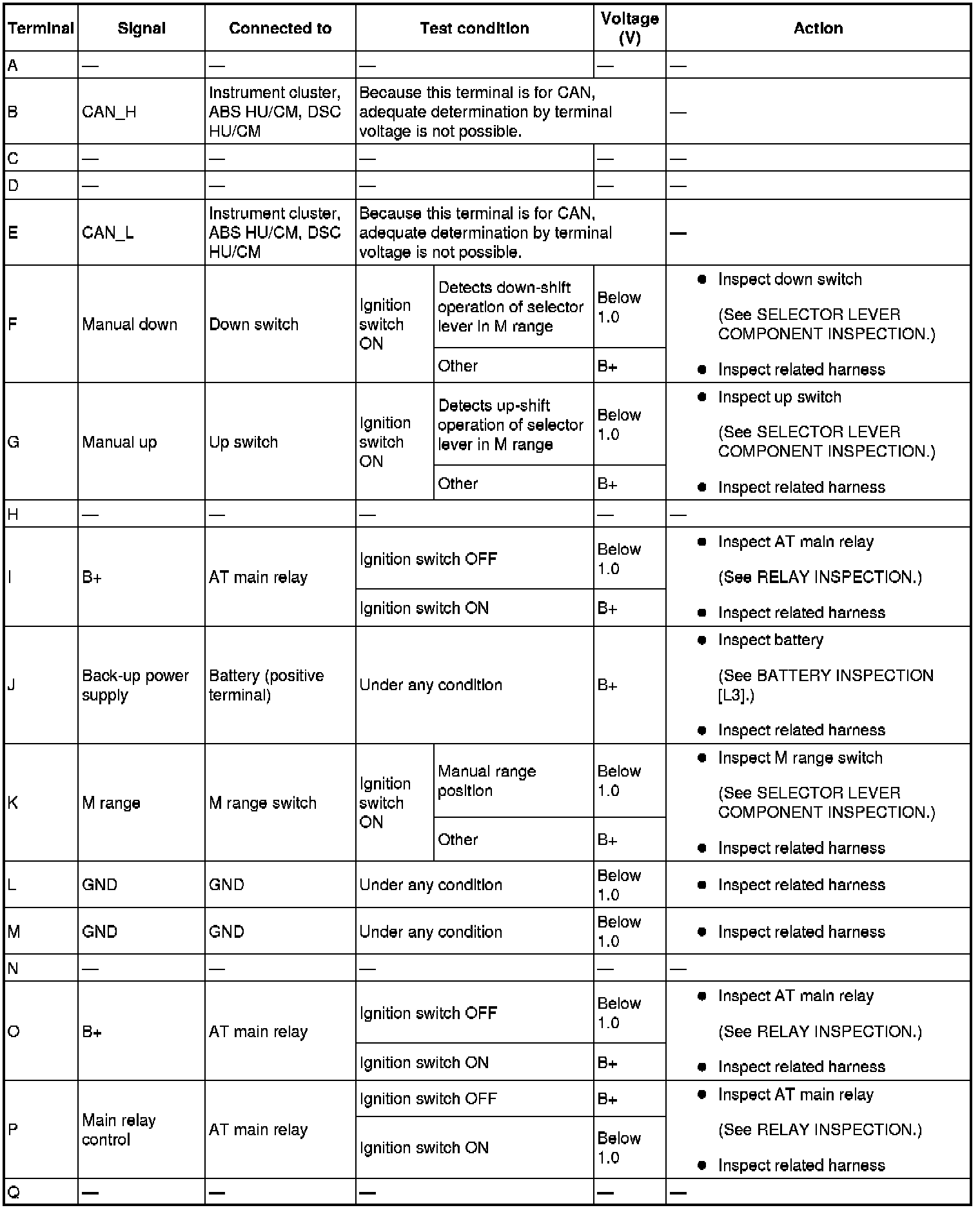 - The TCM terminal voltages vary with changes in measuring and vehicle conditions. Always carry out a total inspection of the input and output systems, and the TCM to determine the cause of trouble. Otherwise, a mis-diagnosis could occur.