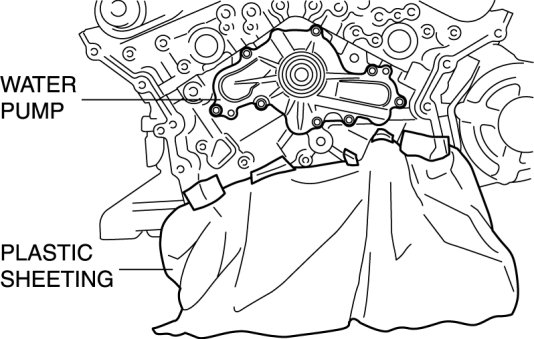 2. To prevent engine coolant from penetrating the oil pan, line the cylinder block with plastic sheeting as shown in the figure before removing the water pump.