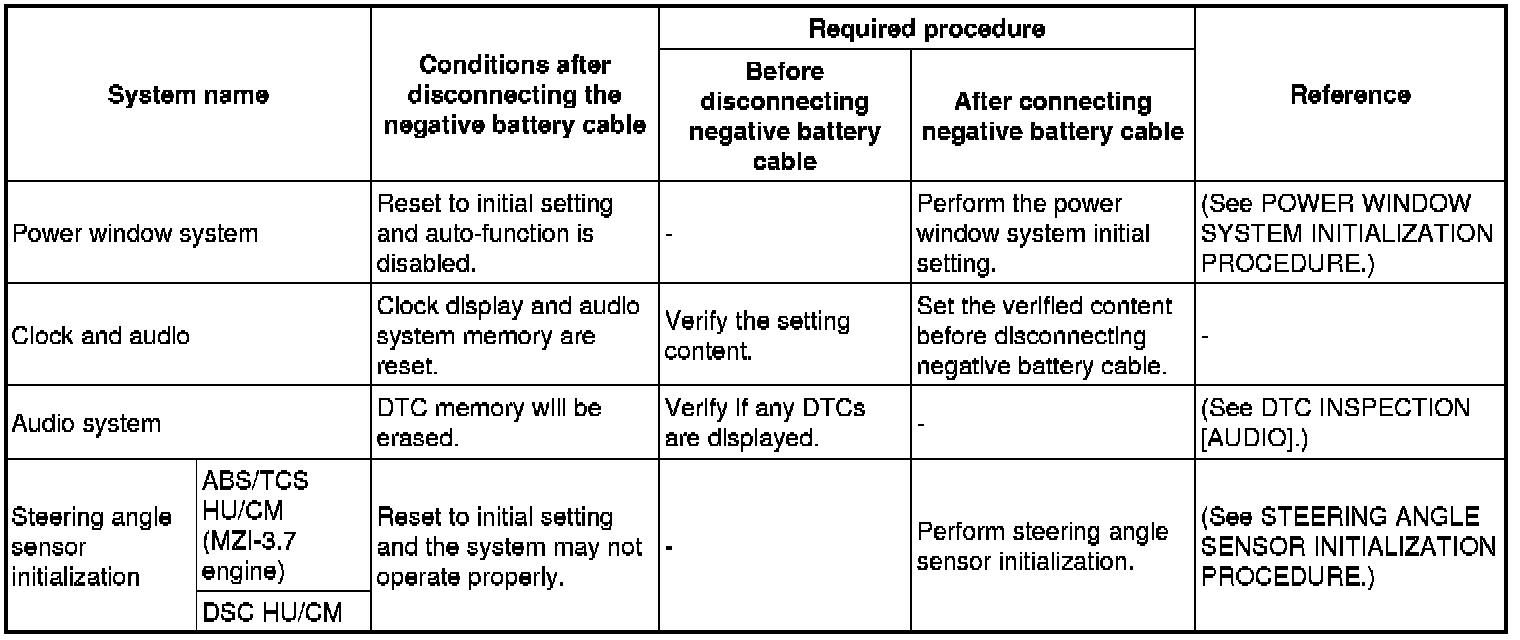 - Before removing the SRS air bag system-related parts, always disconnect the negative battery cable and wait for 1 min. or more to allow the back-up power supply to deplete its stored power.