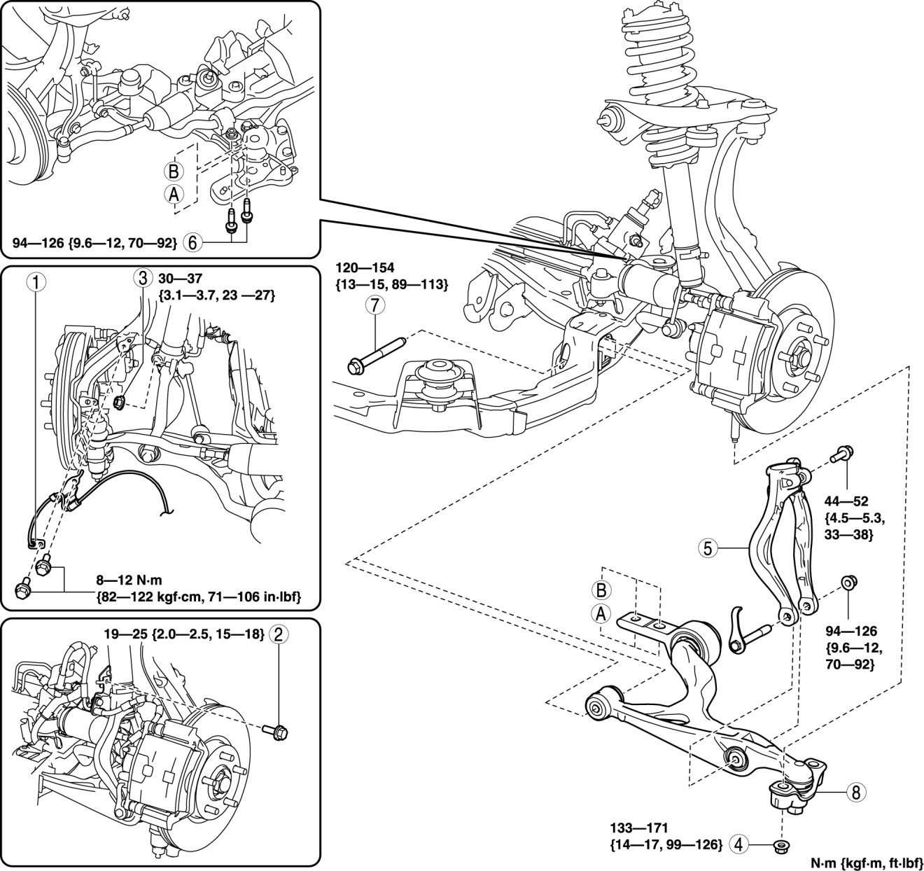 - Nut B: 120-154 Nm {13-15 kgf-m, 89-113 ft-lbf}