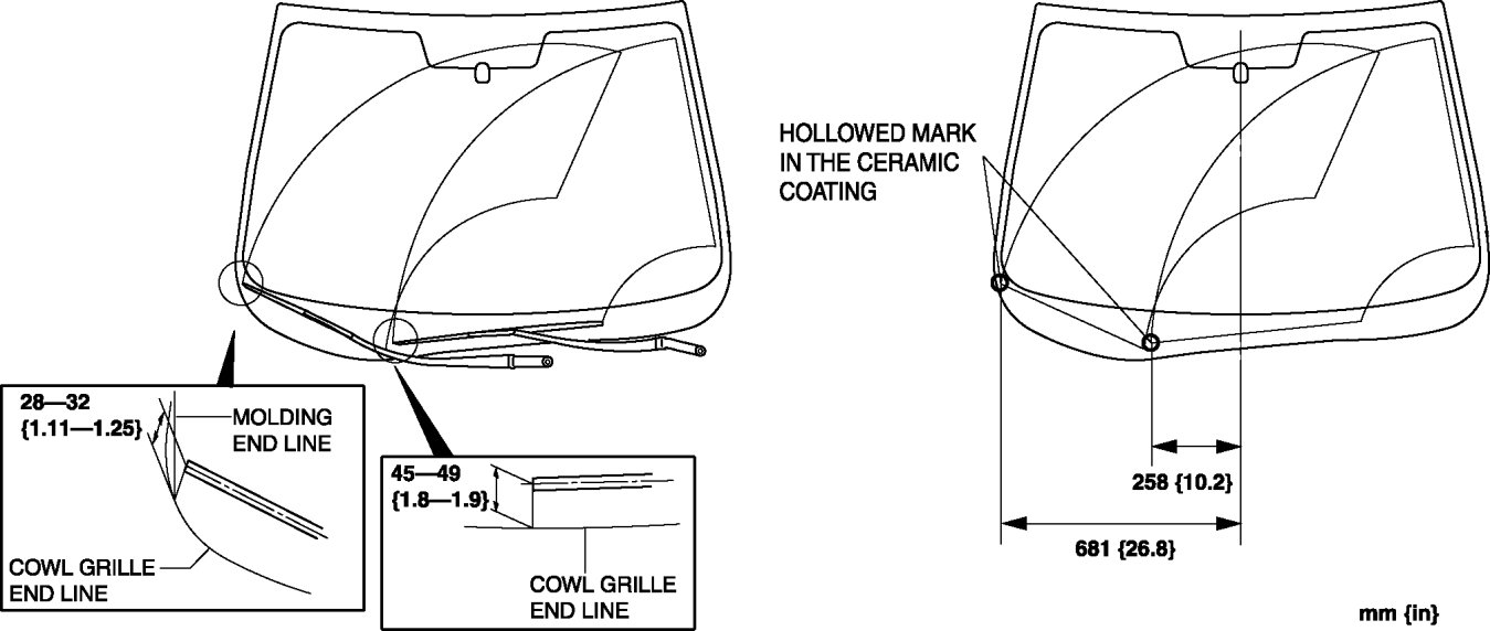 - If the hollowed mark in the ceramic coating cannot be located, measure the distance from the cowl grille end line, and adjust the windshield wiper arm and blade.