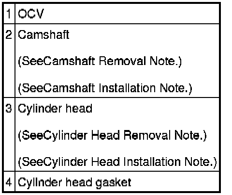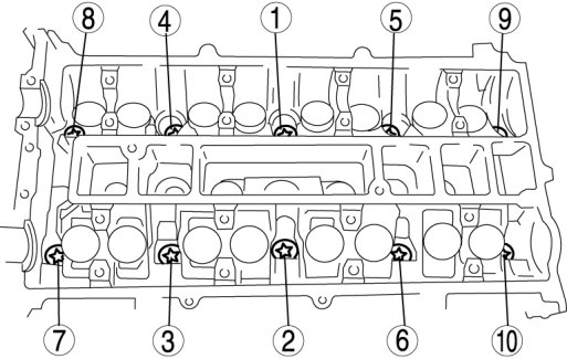 1. Loosen the camshaft cap bolts in two or three passes in the order shown, and remove them.