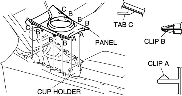3. Pull the panel upward and detach clips A, B and tabs C.