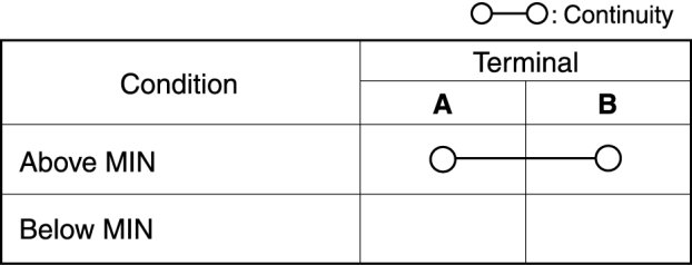 2. Inspect for continuity according to fluid level between the brake fluid level sensor terminals.