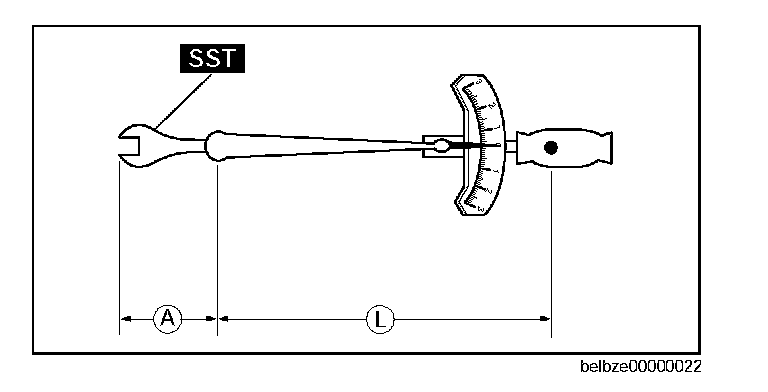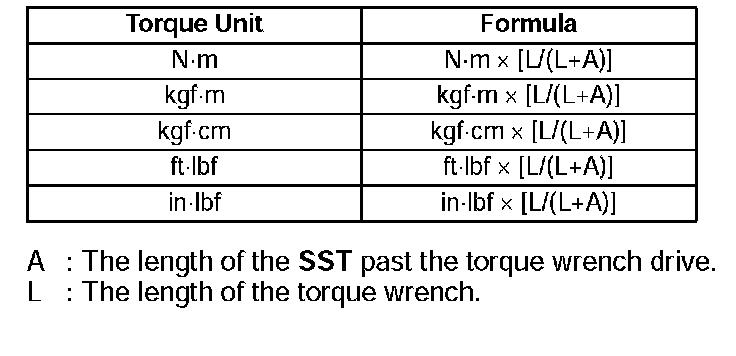 ^ When using a torque wrench-SST or equivalent combination, the written torque must be recalculated due to the extra length that the SST or equivalent adds to the torque wrench. Recalculate the torque by using the following formulas. Choose the formula that applies to you.