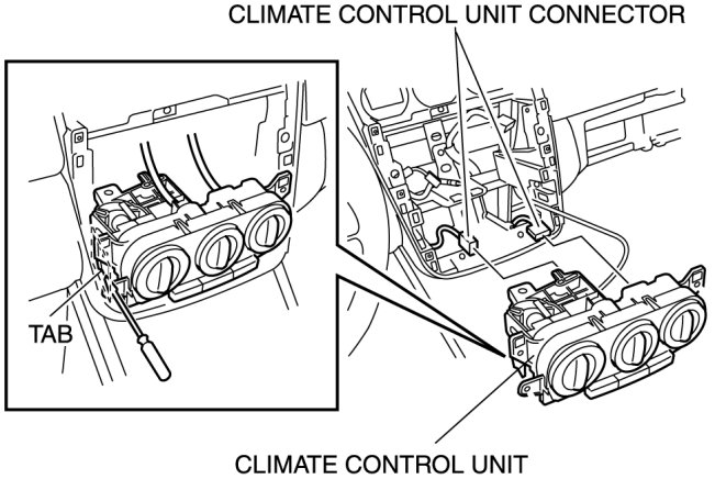 5. Disconnect the climate control unit connectors and remove the climate control unit.