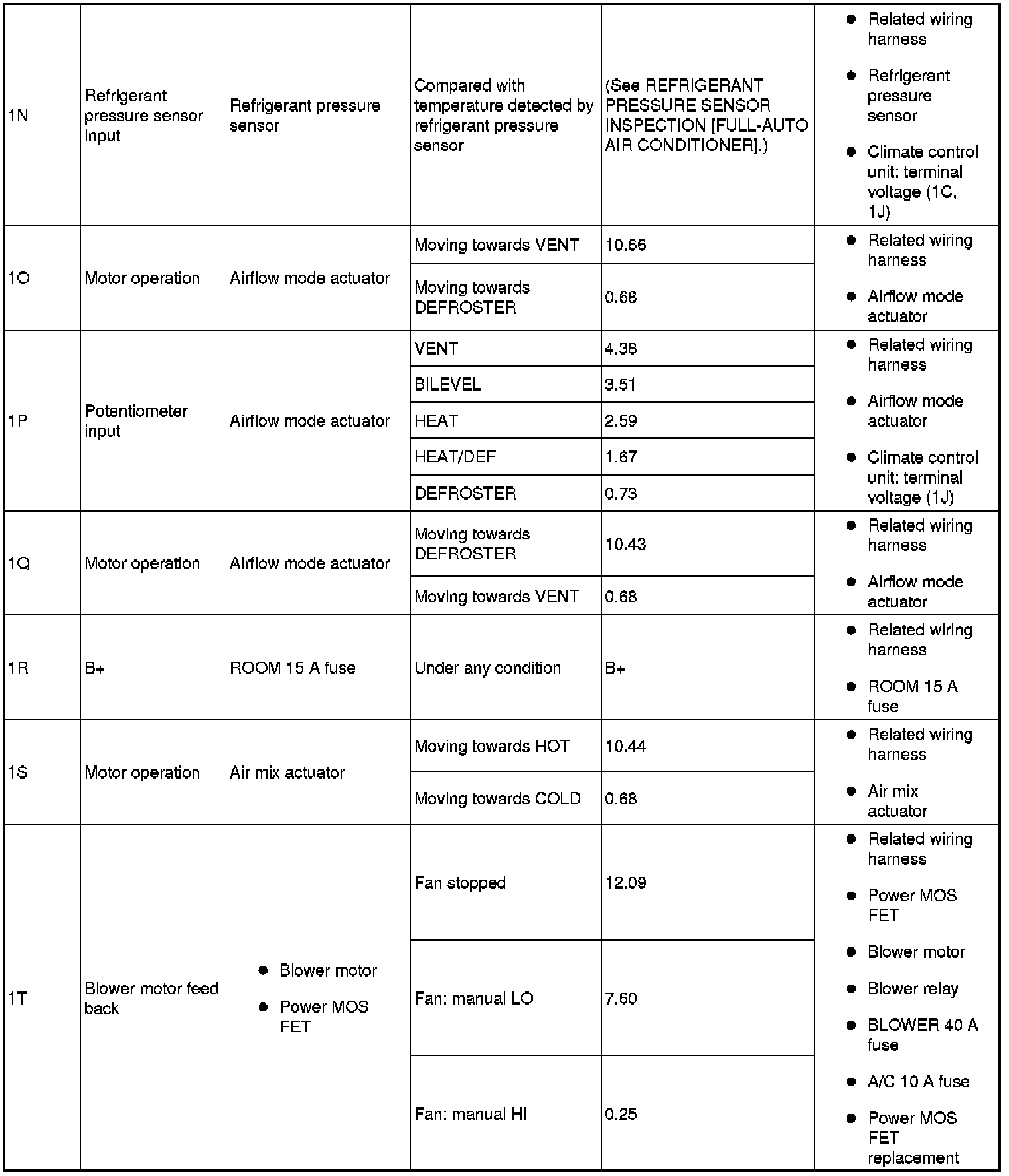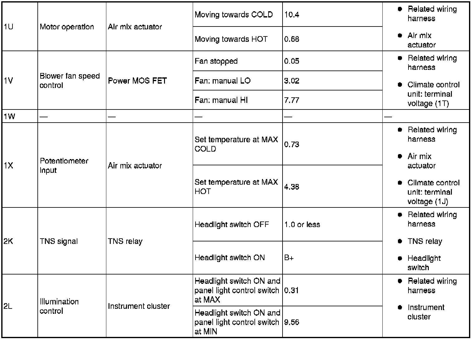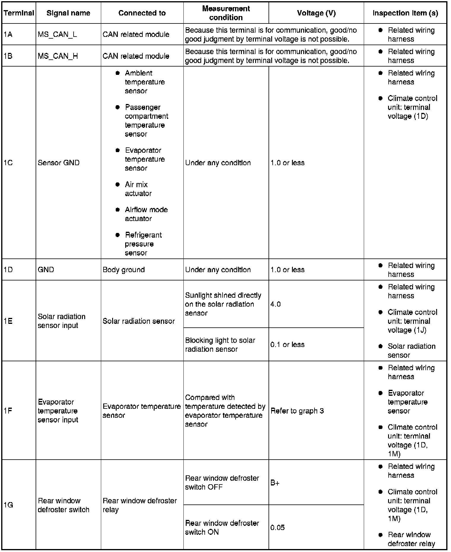 - If the parts under "Inspection item (s)" are found to be normal (except for terminal 1T), replace the climate control unit.