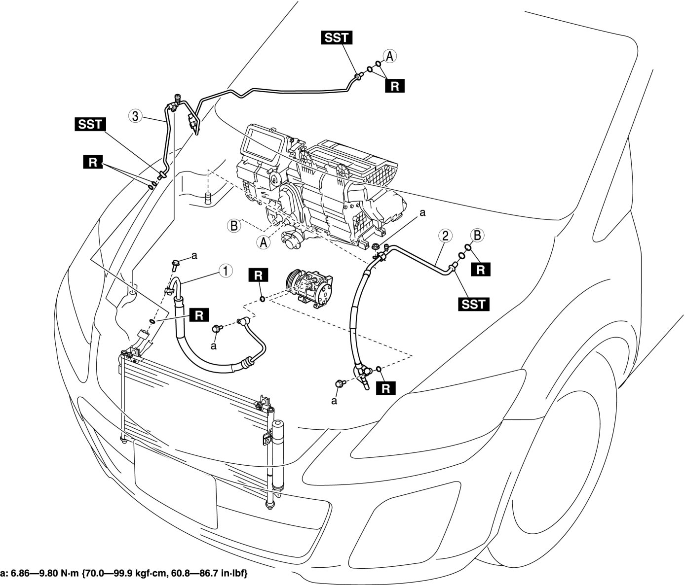 1. When installing a new cooler pipe or cooler hose, add a supplemental amount of FD46XG compressor oil into the refrigeration cycle. Supplemental amount (approx. quantity) 5 ml {5 cc, 0.2 fl oz}: Cooler pipe 10 ml {10 cc, 0.3 fl oz}: Cooler hose
