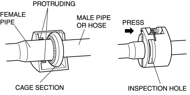 1. Connect the male pipe or hose by pushing it while slightly twisting it onto female pipe until the garter spring at the male pipe or hose is over the flared end of female pipe.