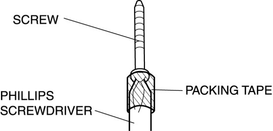 13. Install the screw on the end of the phillips screwdriver with the packing tape.