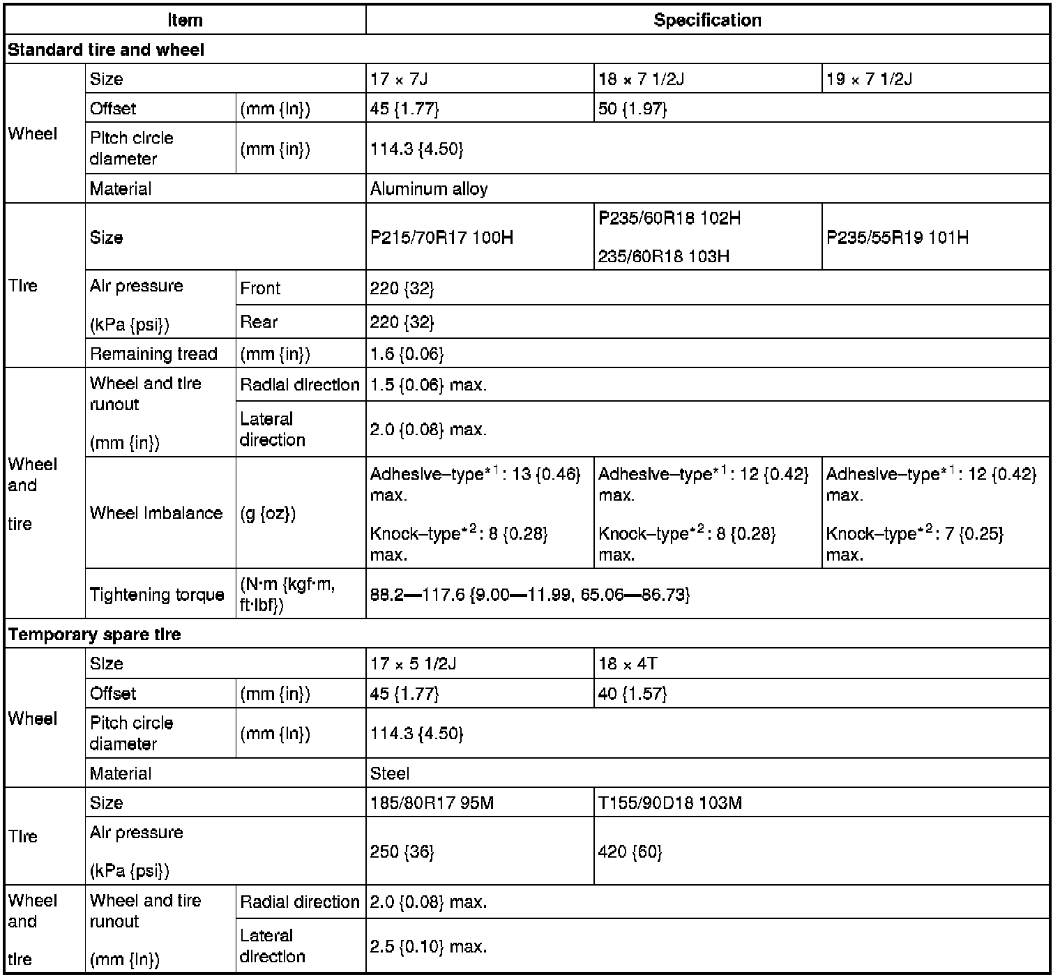 One balance weight: 60 g {2.12 oz} max. If the total weight exceeds 100 g {3.53 oz} on one side, rebalance after moving the tire around on the rim. Do not use three or more balance weights.