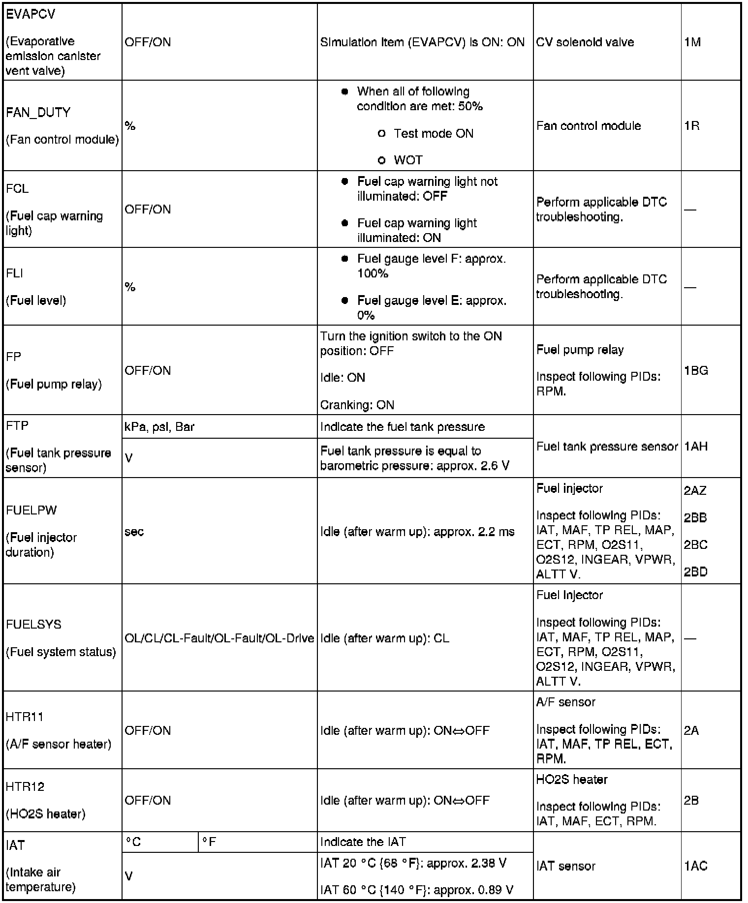 - Refer to PID monitor table for confirm the engine control system operation status while the PCM does not store the DTC. (See Component Tests and General Diagnostics)