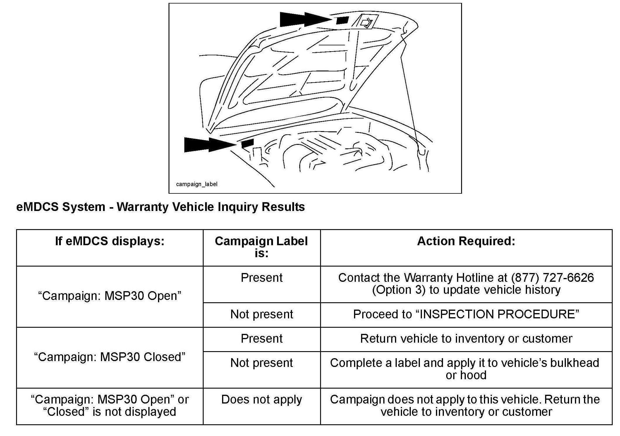 2. Perform a Warranty Vehicle Inquiry using your eMDCS System and inspect the vehicle for a Campaign Label MSP3O attached either to the vehicle's bulkhead or to the vehicle's hood. Refer to eMDCS System - Warranty Vehicle Inquiry Results table below.