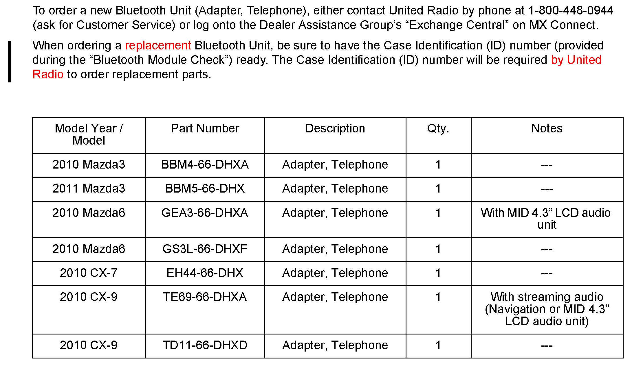 For Bluetooth Units requiring replacement, a Case Identification (ID) number will be provided by the online system. Write the Case ID on the vehicle Repair Order. The Case ID will be required to order replacement parts.
