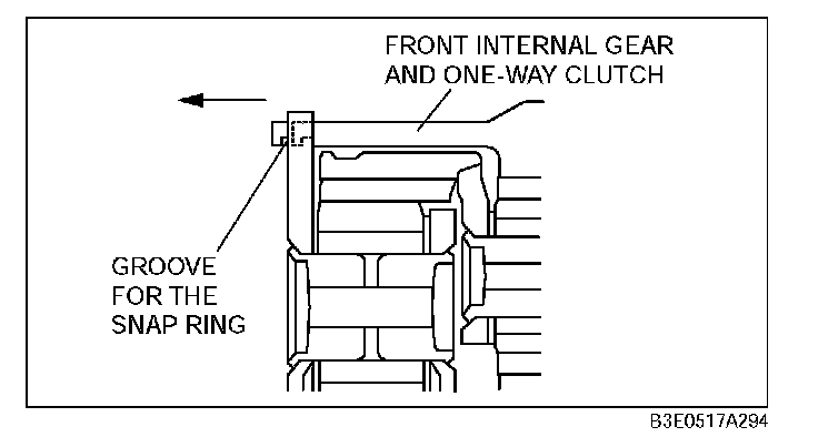 Note: Rotate the engine stand so that the oil pan faces downward. Pull the front internal gear and one-way clutch component a little until the groove for the snap ring appears, then install the snap ring.