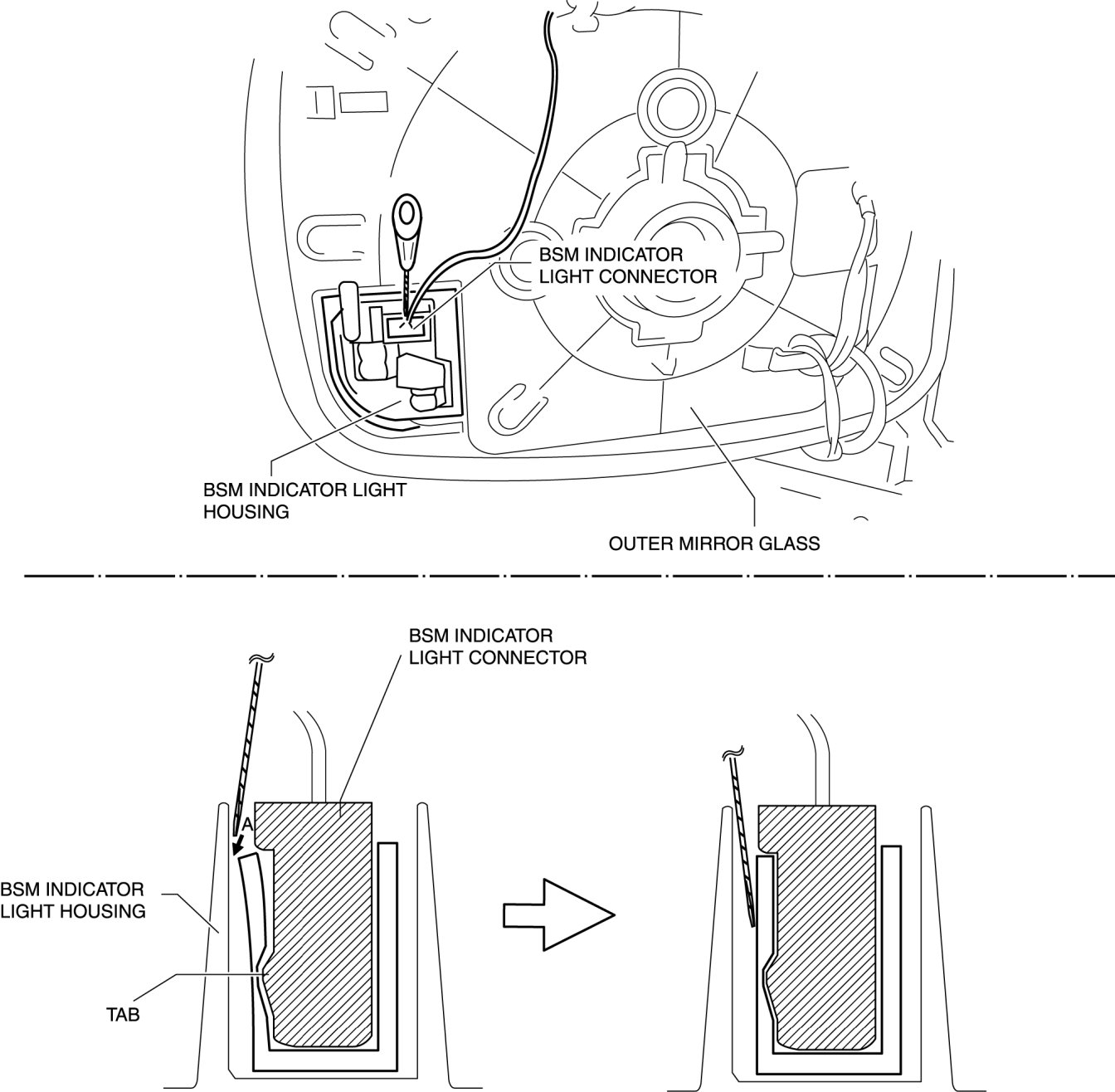 - Lightly pull the BSM indicator light connector and verify that the BSM indicator light housing cannot be pulled off. If the connection is poor, insert a tape-wrapped flathead screwdriver into position A shown in the figure and engage the connector.