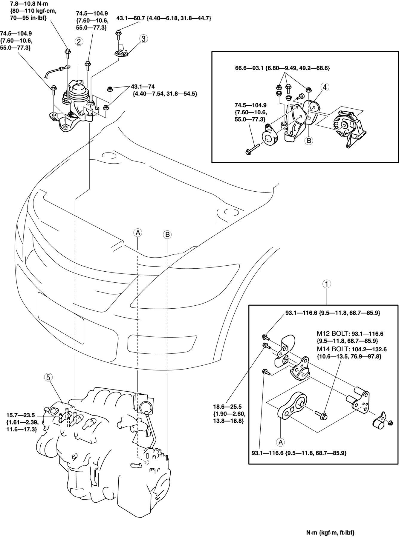 - Bolt A, B: 93.1-116.6 Nm {9.5-11.8 kgf-m, 68.7-85.9 ft-lbf}