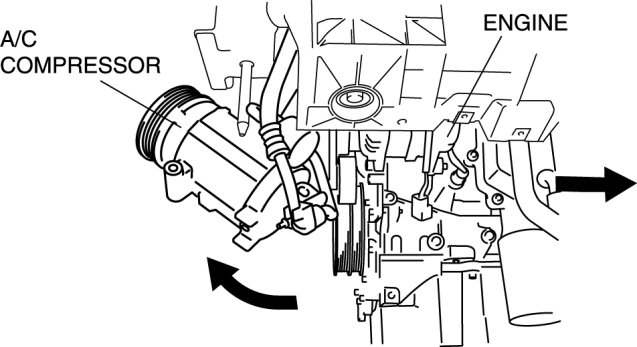 26. Remove the A/C compressor with the pipes connected and secure the A/C compressor using wire or rope so that it is out of the way. Service and Repair