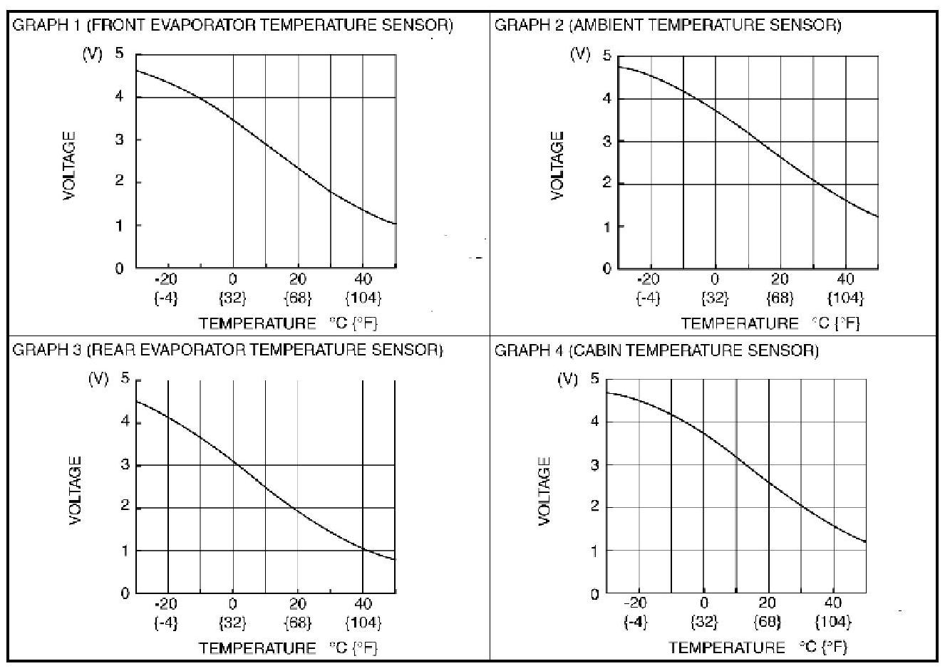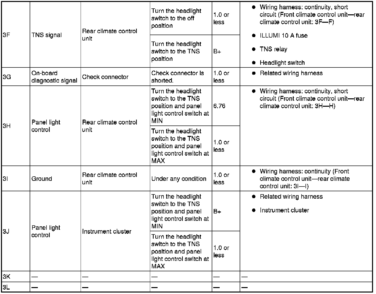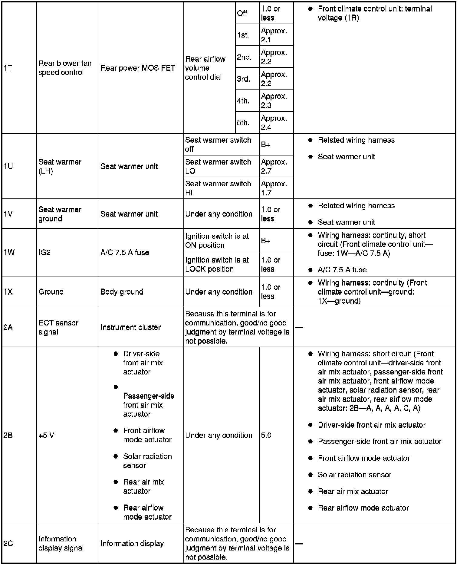 4. By inserting the positive (+) lead of the tester into each front climate control unit terminal, measure the voltage according to the terminal voltage table.