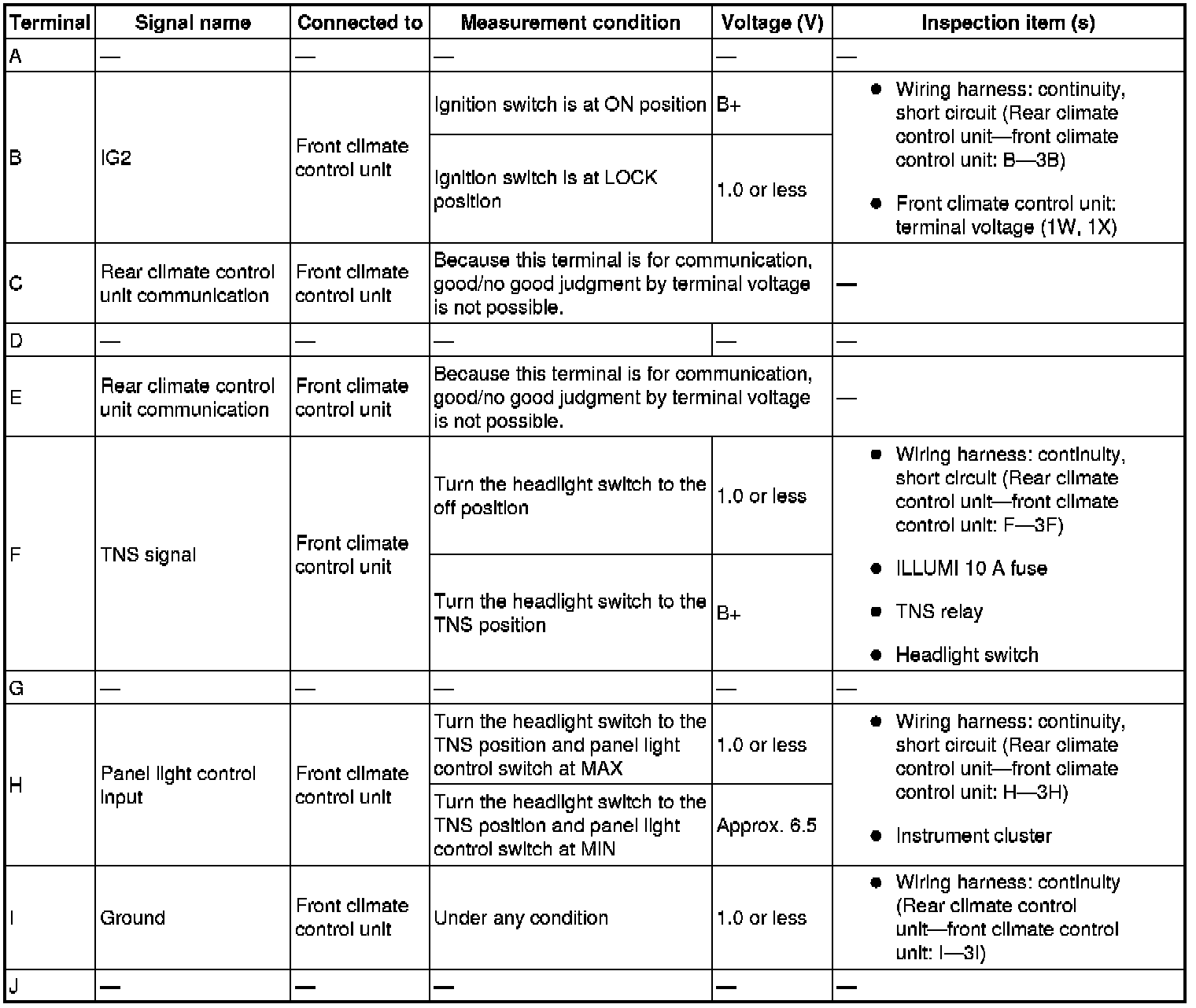 4. By inserting the positive (+) lead of the tester into each rear climate control unit terminal, measure the voltage according to the terminal voltage table.