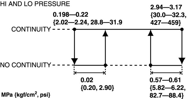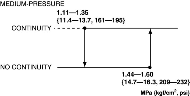 3. Verify the high-pressure side reading of the gauge and continuity between the refrigerant pressure switch terminals.