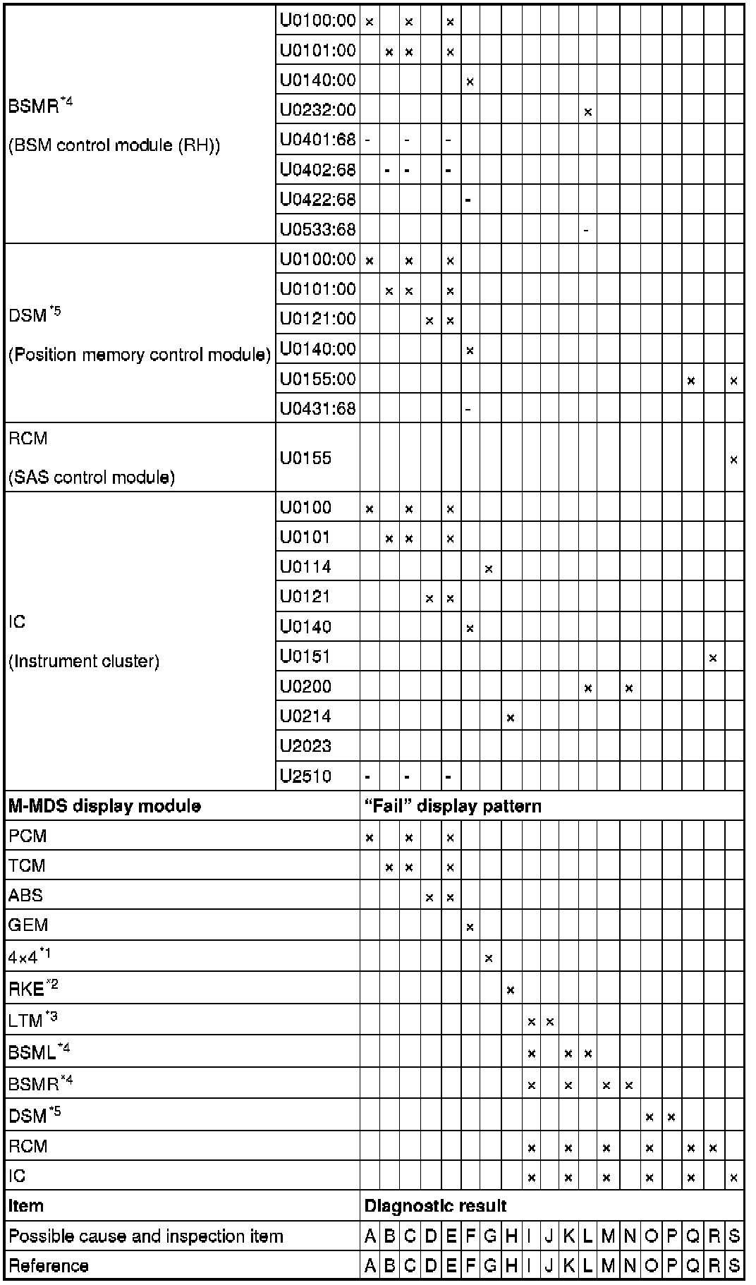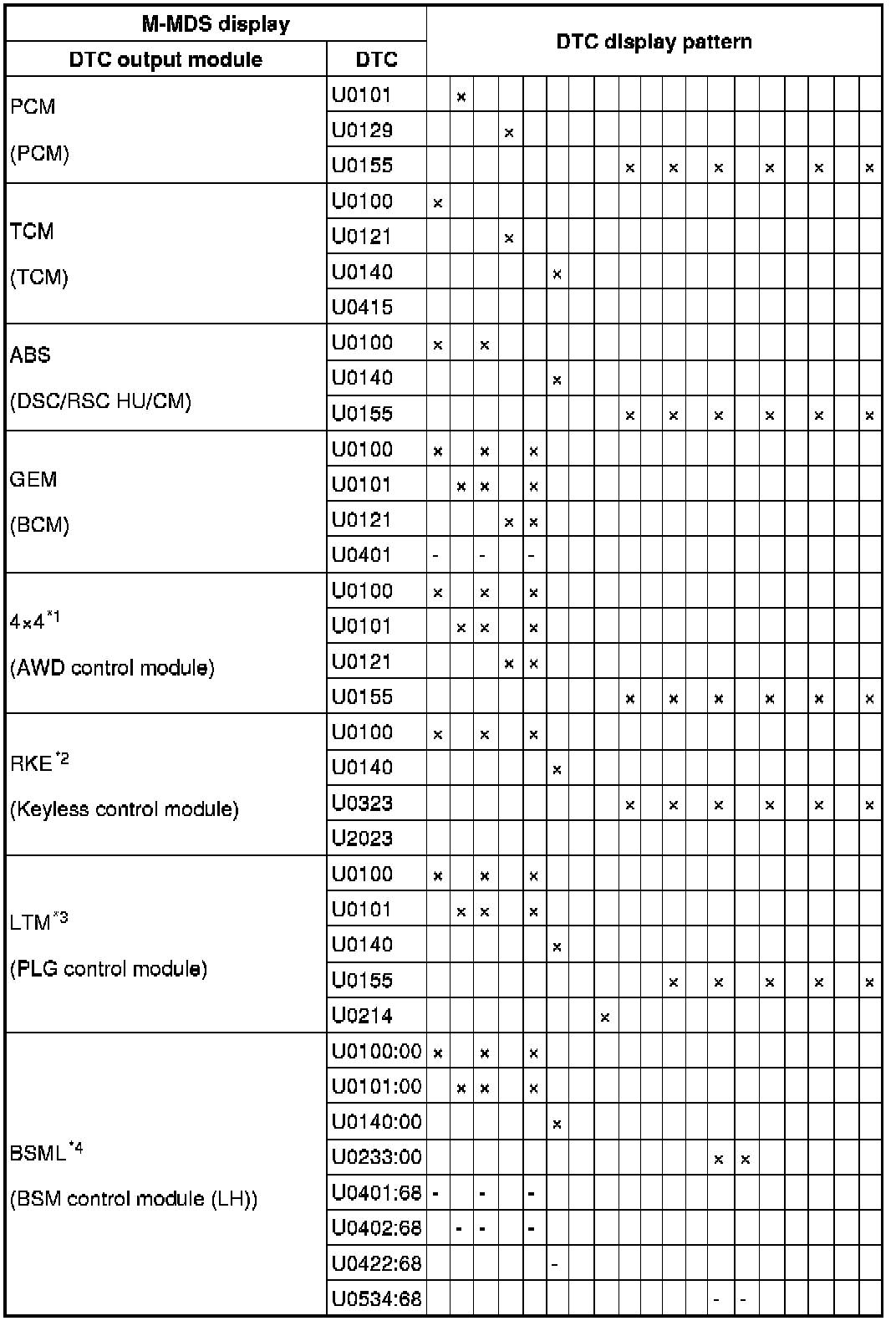 - A hyphen(-) in the DTC output pattern table indicates that the DTC may be displayed depending on the malfunction detection conditions. If only an (x) is indicated, it means the DTC will not be displayed.
