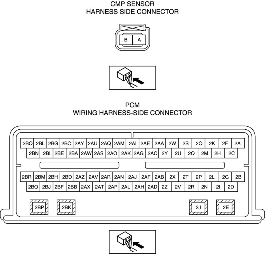 - CMP sensor (RH) terminal A and PCM terminal 2X