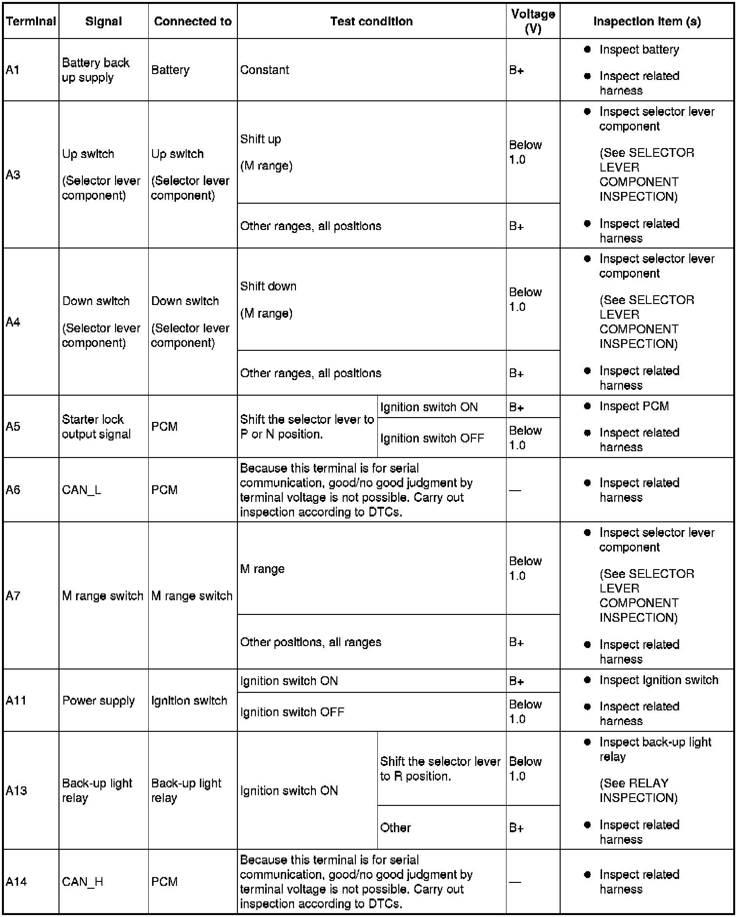 - If the voltage is not as specified in the Terminal Voltage Table (Reference), inspect the parts under "Inspection item (s)".