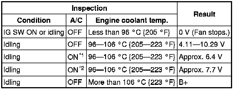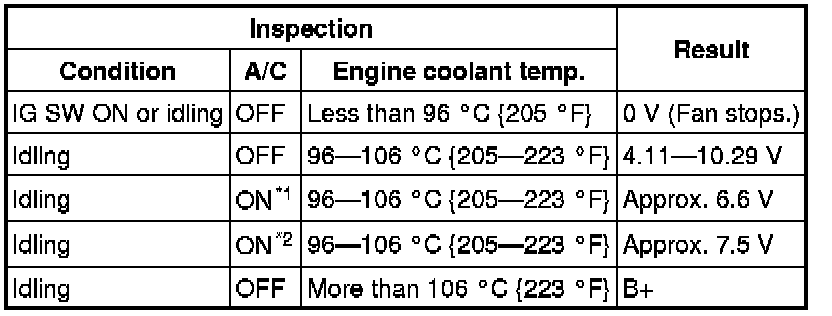 4. Measure the voltage at terminal 2 of the fan control module connector (2 terminals) as shown in the table.