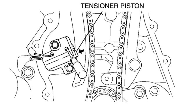 3. Remove the retaining wire or paper clip from the chain tensioner to apply tension to the timing chain.