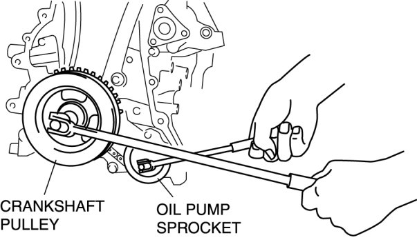 2. Install the oil pump sprocket, and then remove the crankshaft pulley and crankshaft pulley lock bolt.