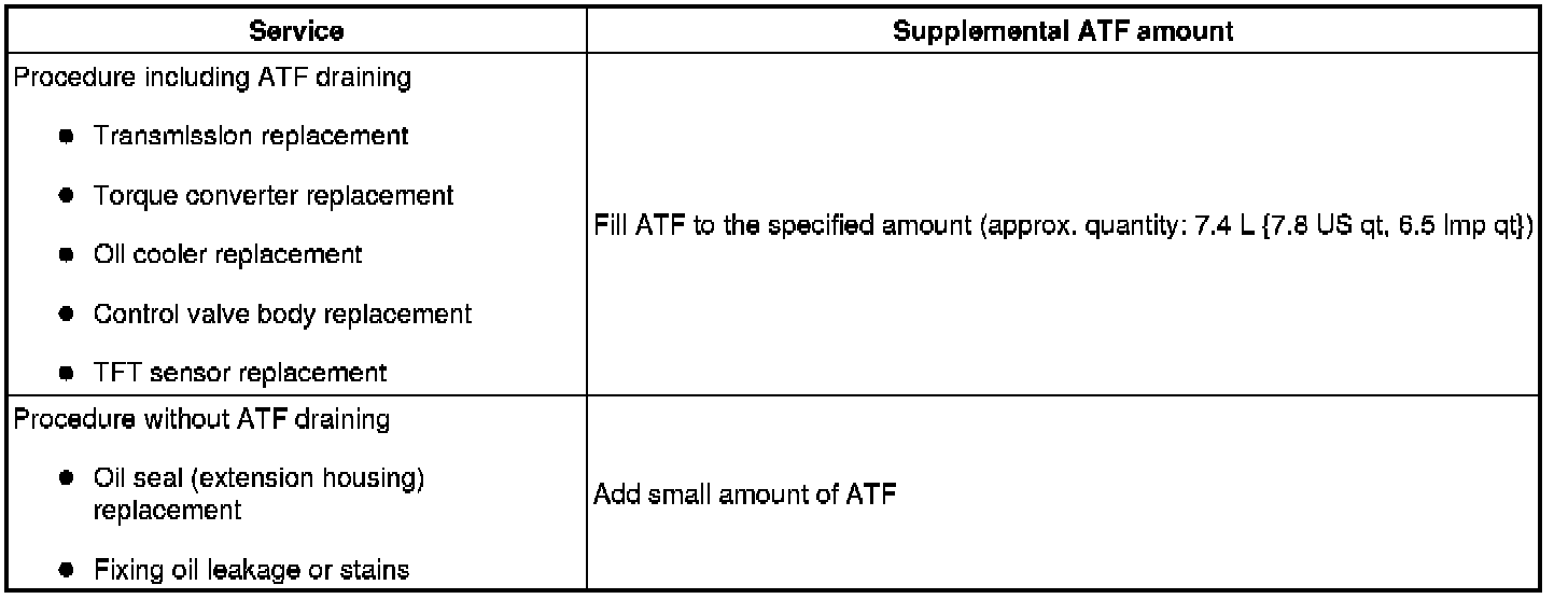 - The ATF level cannot be adjusted correctly if the ATF temperature is not within a normal range (50-60 °C {122-140 °F}). Always perform the servicing according to the adjustment procedure.