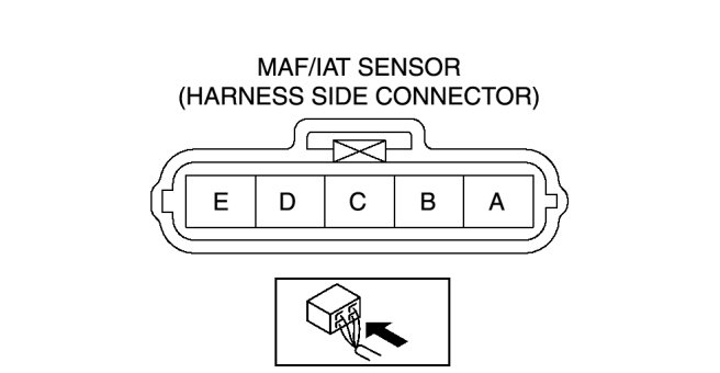 4. Verify that the resistance between MAF/IAT sensor terminals D and E is within the specification.