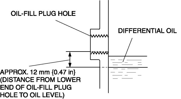4. If the oil level is lower than approx. 12 mm {0.47 in} from the lower end of the oil-fill plug hole, inspect for oil leakage and add the specified oil.