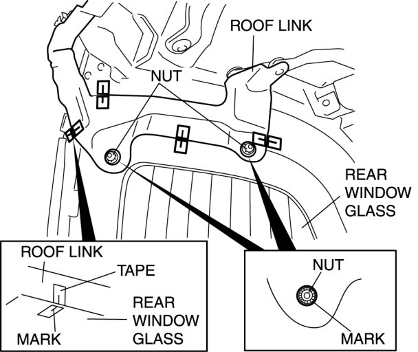 - If the rear window glass or middle roof panel is to be used, positioning and adjustment during installation will be easier by placing marks for the installation before removal.