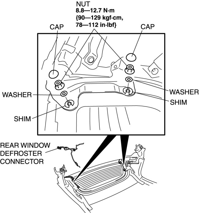 - The number of shims varies depending on the location of the rear window glass installation nut. Adjustment will be easier by verifying the number of shims to be used before removing the rear window glass.