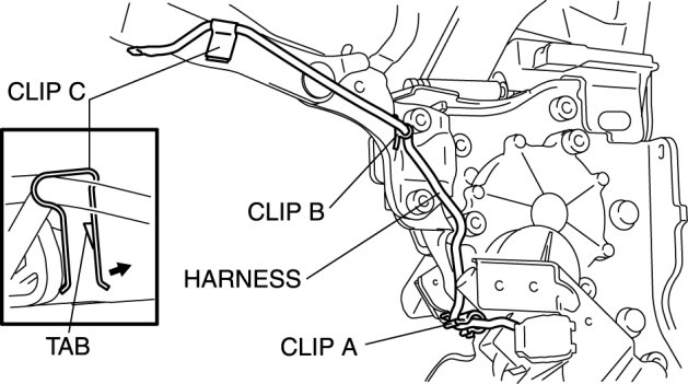 3. Remove clip B, then remove clip C while pulling it in the direction shown by the arrow avoiding the tab.